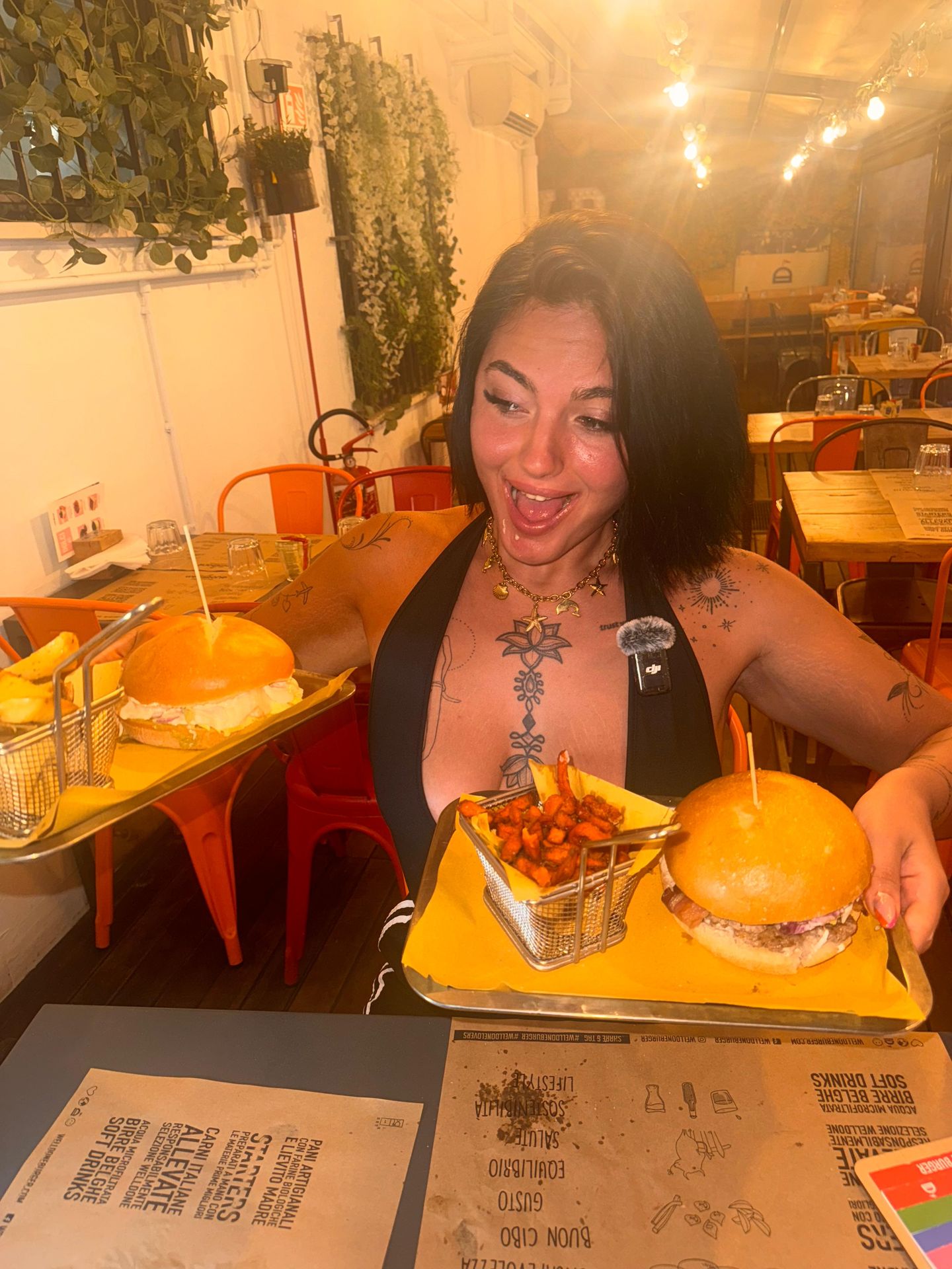 Abbiamo iniziato con una porzione di polenta fritta: croccante, dorata e davvero irresistibile. Poi via ai panini: Io ho scelto un hamburger super fat con bacon, funghi e parmigiano, ricco e goloso, mentre Mik è andato sulla versione più fresca e leggera con un panino GF al gambero alla griglia, avocado e lattuga.